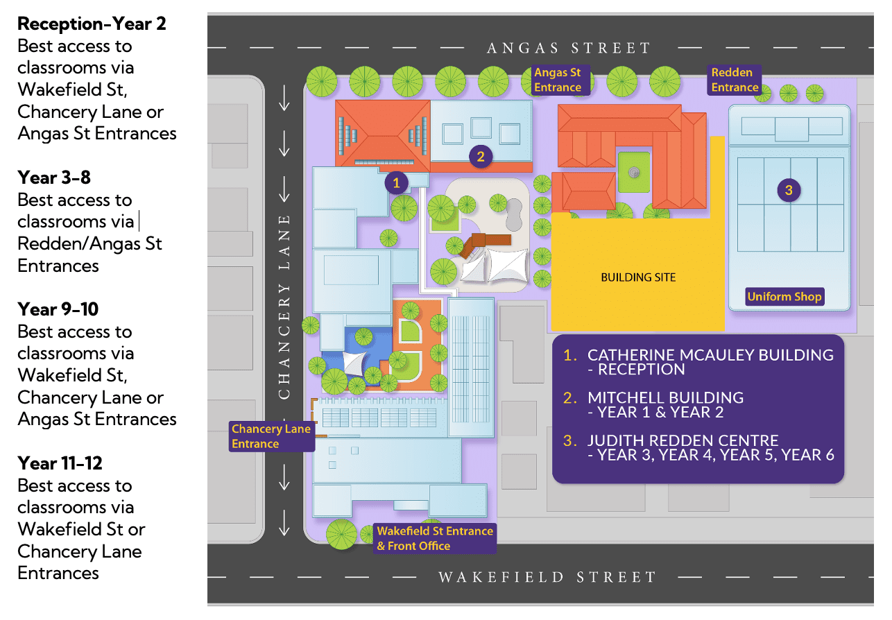 With the ongoing construction, we have suggested entrances to the College that would be most suitable for each year level to avoid congestion given the restricted access we will have to the Redden Driveway.