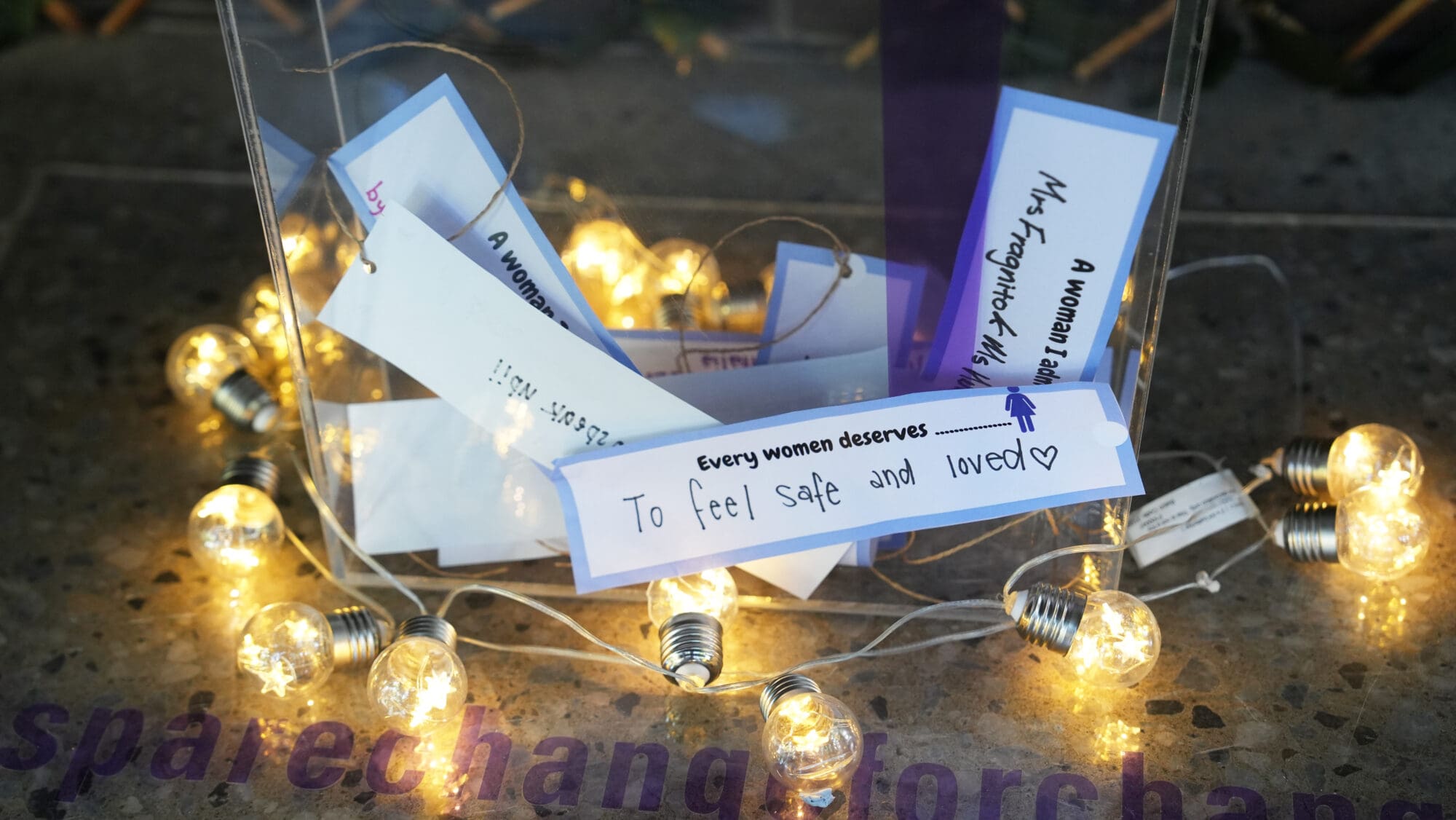 From there, students were invited to participate in The Reflection Tags – “How Can I Help Balance the Scales?” Using purple tags, students wrote personal reflections responding to prompts such as “Every woman deserves…”, “Safety means…”, and “A home should feel…”. These reflections were then attached to the Catherine House structure itself. Over the course of the week, the installation slowly transformed as the structure became covered in messages of hope, empathy and commitment from students, staff and parents.