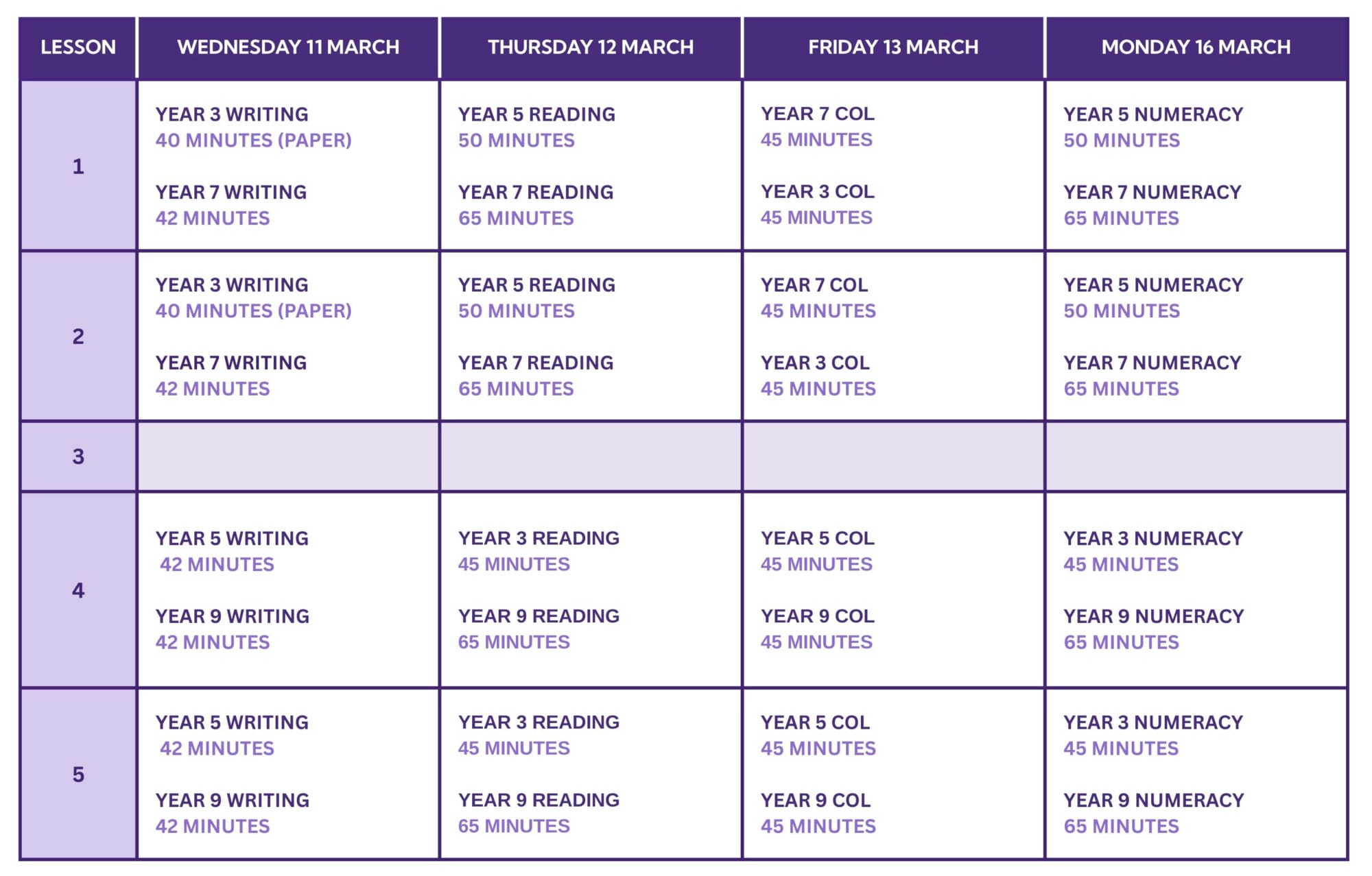 The test schedule appears below, please note that the lesson time allocated also includes preparation (logging on to the NAPLAN browser, testing headphones etc.) and time for finalising the test sessions.