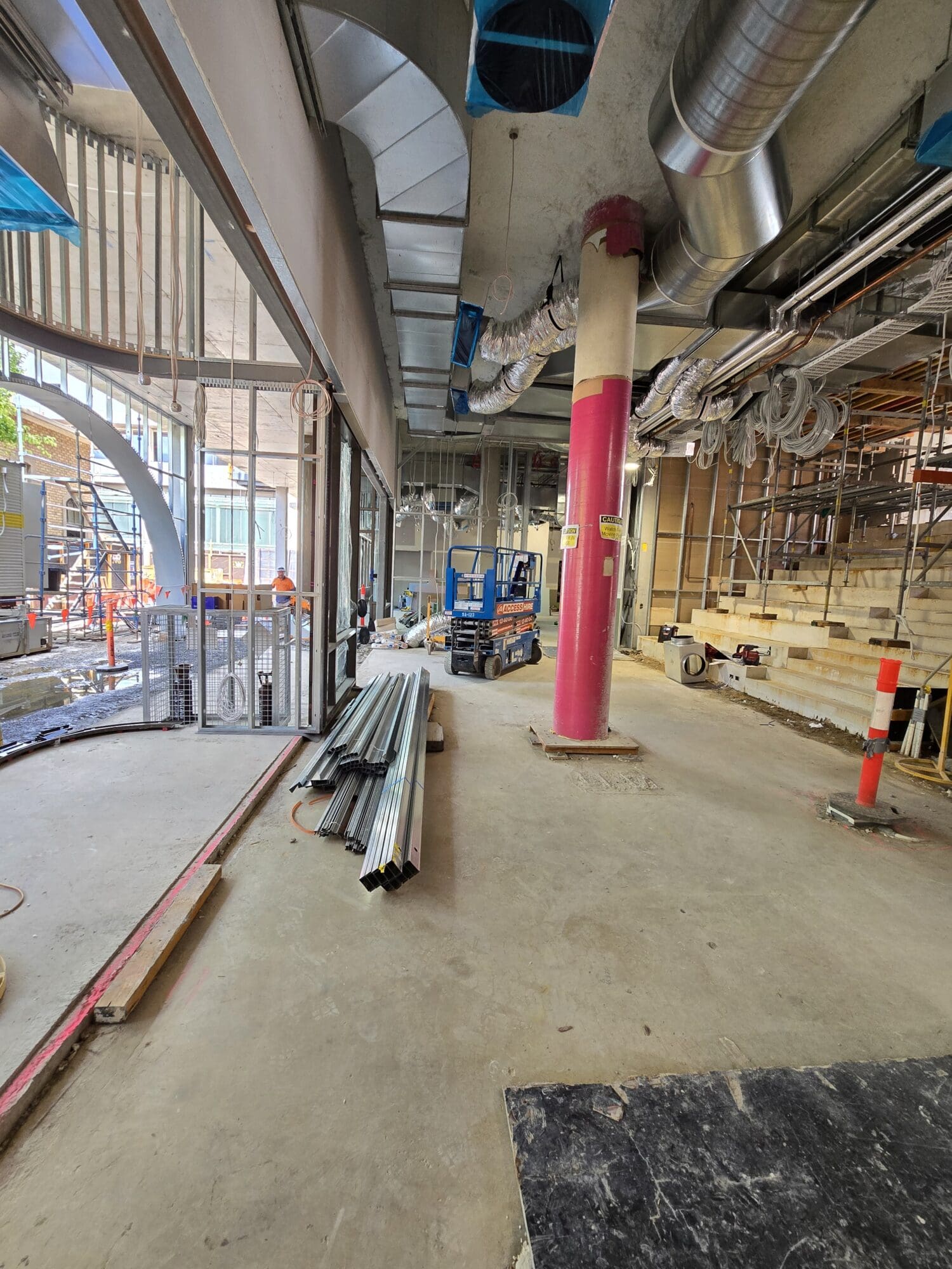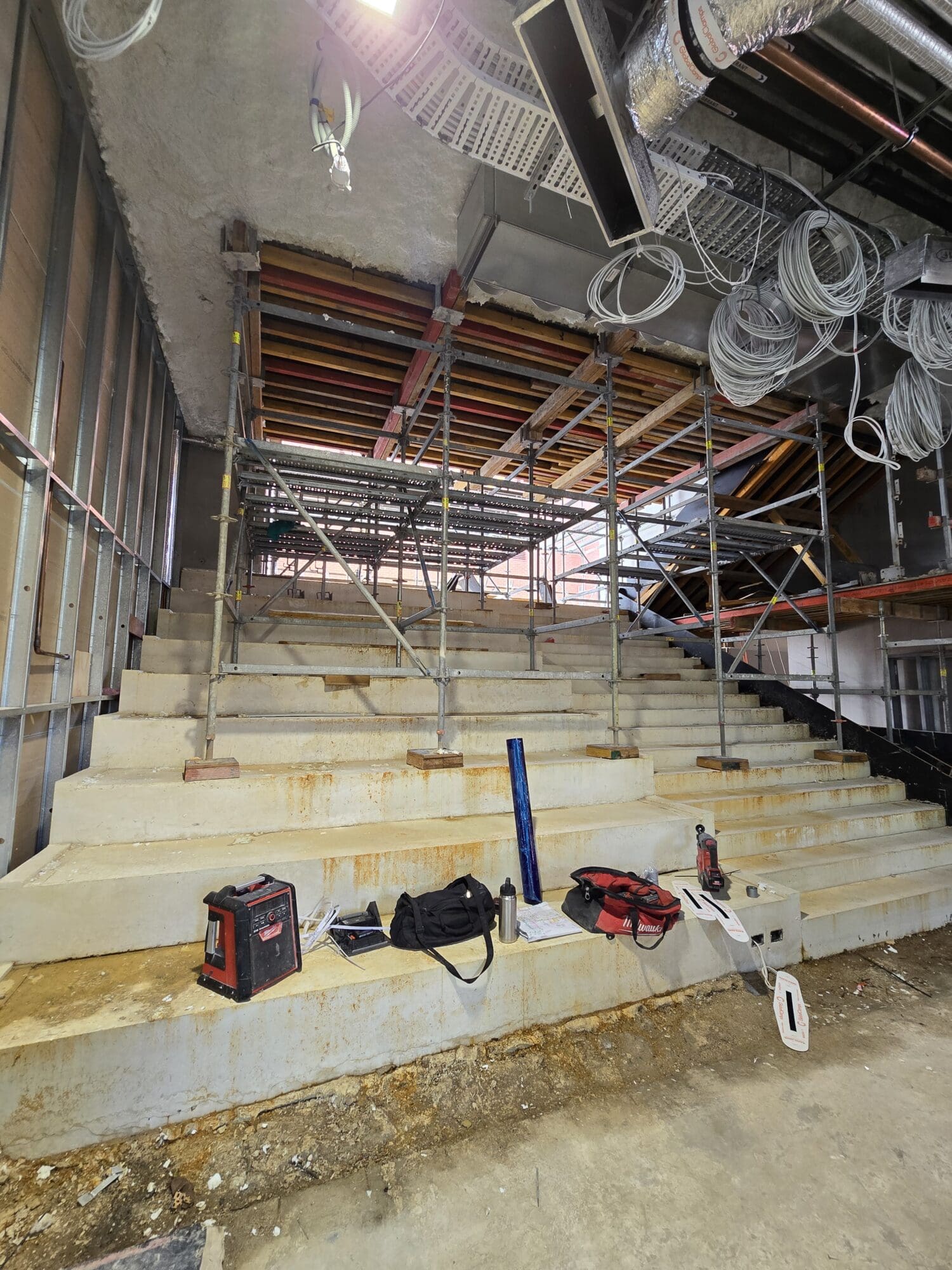 Now that the structure has topped out, the interior of the Dunlevie Project is where most of the action has been these past few weeks. The ground floor Reception and Music classrooms, changerooms and offices are taking shape as the walls have been installed, giving context to the space and an ability to walk the corridors as they will exist. The ground floor theatre stairs have been poured and will be a highly anticipated learning space for staff and students alike with the flexibility that they will provide.