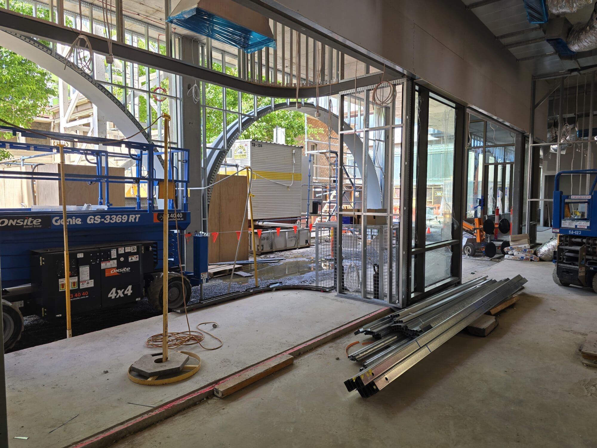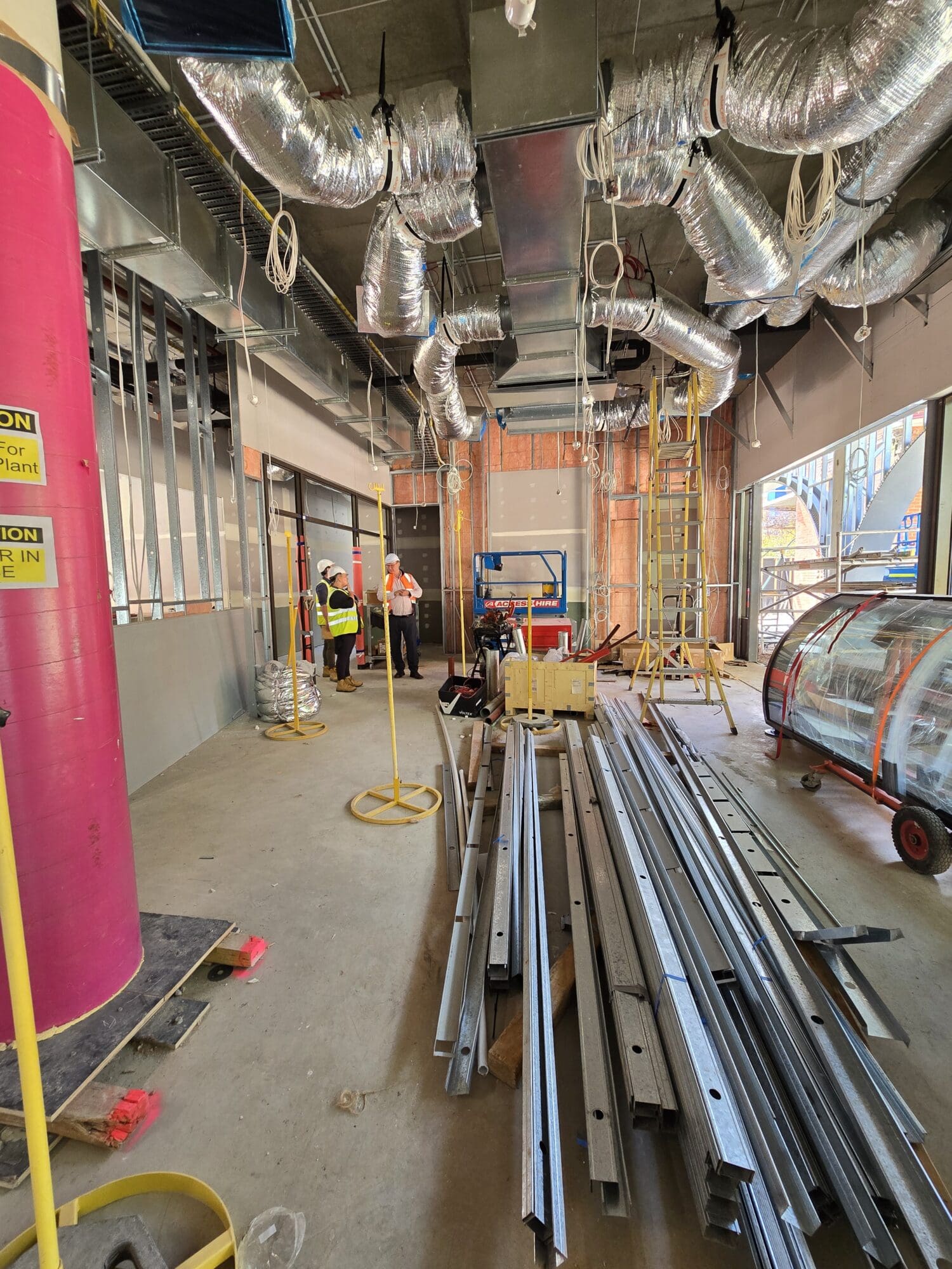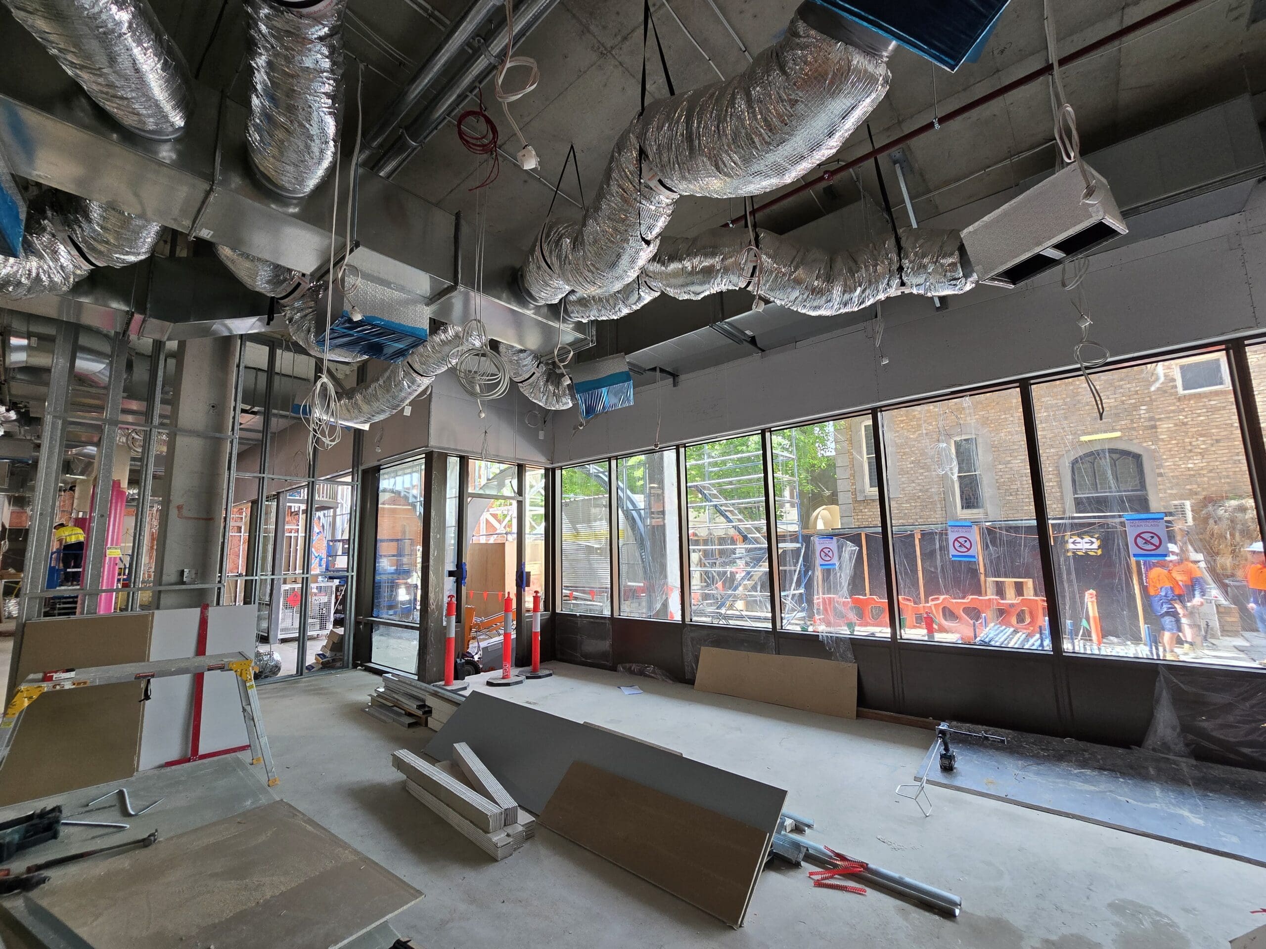 While we have been busy looking up, exciting developments have also been taking place inside the building and especially on the ground floor. The expanse of the interior is being appreciated as the drawings come to form, with the ground floor now wall framed, first fix services completed and gyprock now being installed.