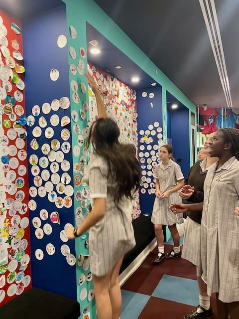 The students also engaged in a studio experience exploring the work of Layne Dhu-Dickie. They created circular images as ‘paste ups’ to add to a collaborative artwork about personal superpowers. It was a meaningful and memorable experience that deepened students’ understanding of contemporary Indigenous art while encouraging them to express their own creative voices.