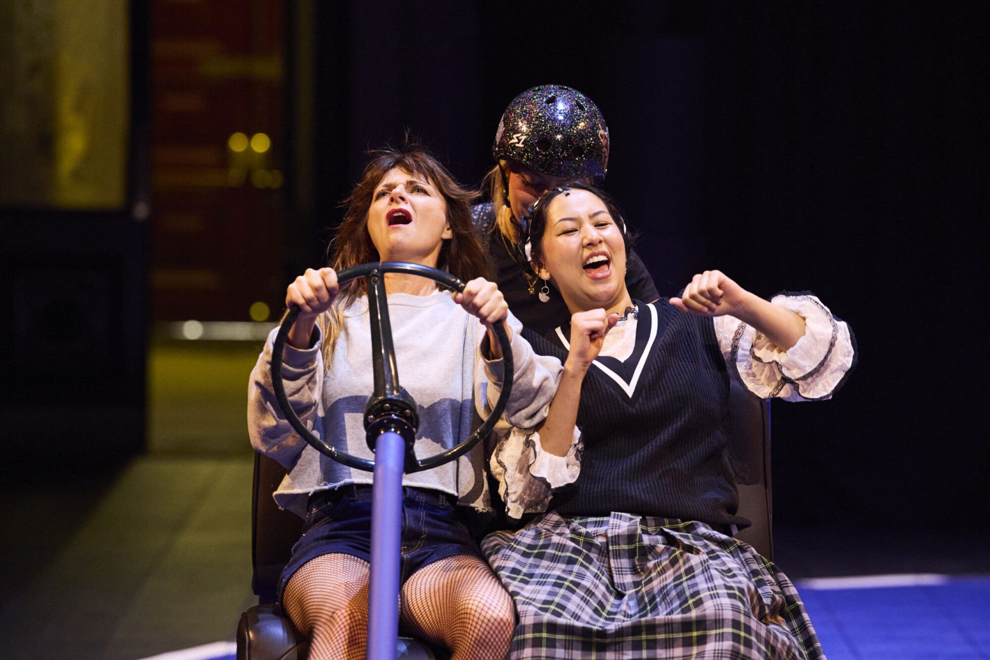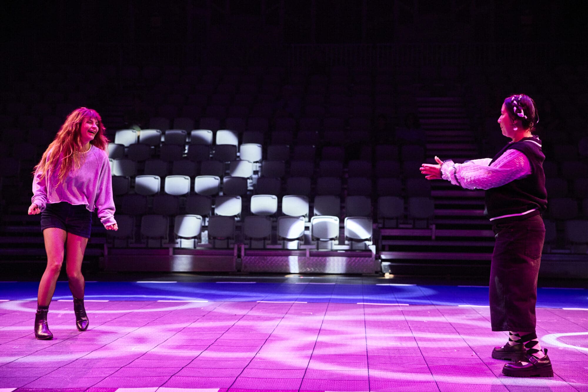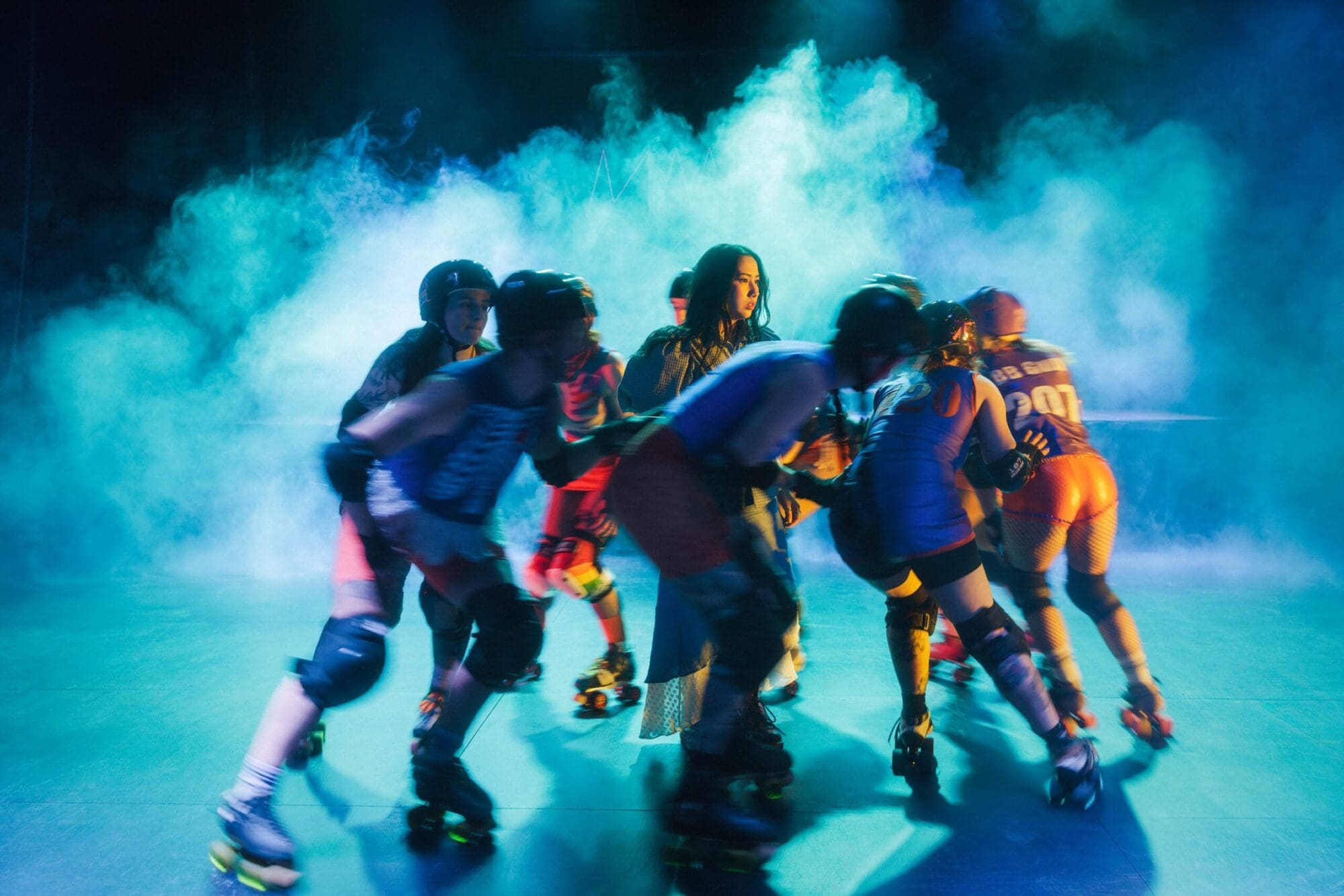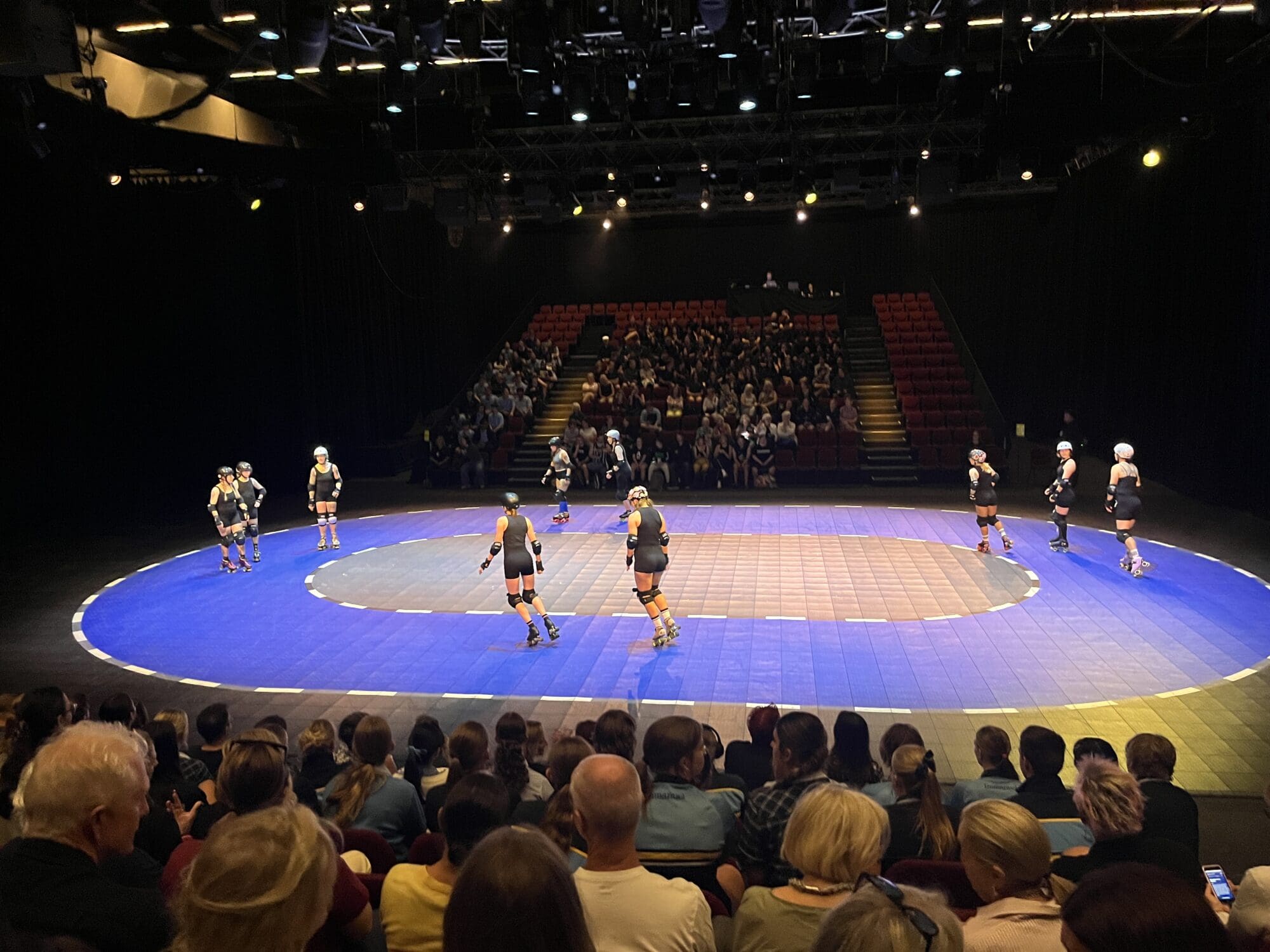 The production is unlike any theatre you’ve likely seen before. This is a performance in constant motion, when you enter the theatre, real-life members of the Adelaide Roller Derby League are already circling a projected track, and the audience is arranged in two halves facing each other across the traverse stage. The entire set is on wheels, creating a constant feeling of motion and a dreamlike quality that shifts and changes throughout the show.